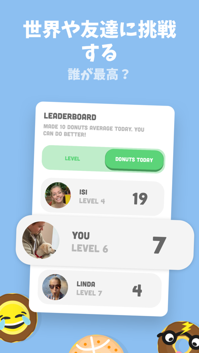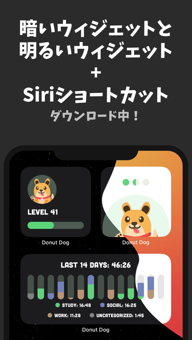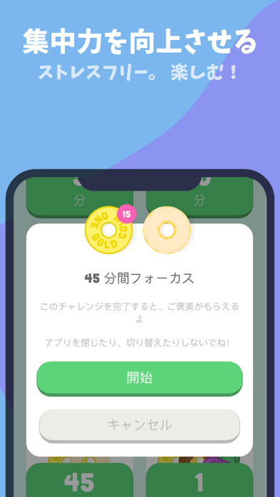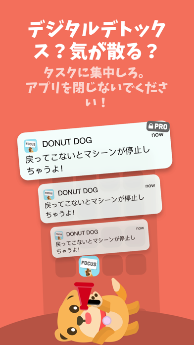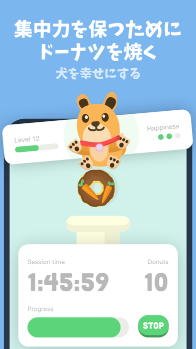 スマホを開かずに集中した時間だけ、ドーナツを作ることができます。誘惑に負けてアプリを離れると、ドーナツ作りは停止。バーチャル犬を喜ばせるためにも、集中してタスクに取り組みドーナツをたくさん作りましょう。