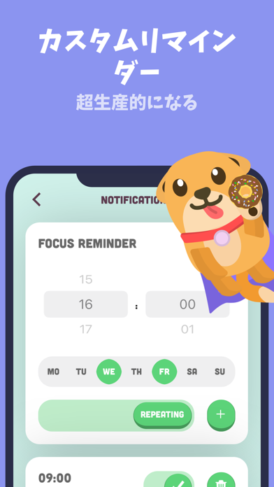 可愛いバーチャル犬のため、タスクに集中しようと思えるアプリ。タスクに集中した時間経過で、バーチャル犬が大好きなドーナツを作れます。ドーナツのコレクション図鑑や集中して取り組んだタスクの視覚化など、モチベーションをあげる機能が満載。可愛いバーチャル犬と一緒に、集中してタスクをこなしましょう。