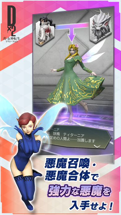 真・女神転生シリーズのスマホオリジナル版です。スマホから悪魔を召喚し、使役する力を持つ者「D×2(ディーツー)」となり、様々な悪魔を従え戦っていきましょう。