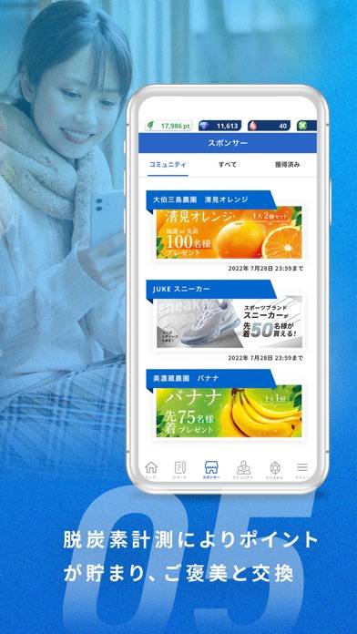 脱炭素量や活動量に応じたポイントを貯めることができます。そして、貯まったポイントはアプリ内で表示されるご褒美と交換可能。交換できるご褒美は日用品や食品など身近な生活の役に立つものから、クーポン券などのサービスまで多岐にわたります。