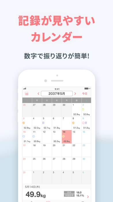 - 入力忘れ防止のリマインダーを搭載。体重管理の習慣化に便利
