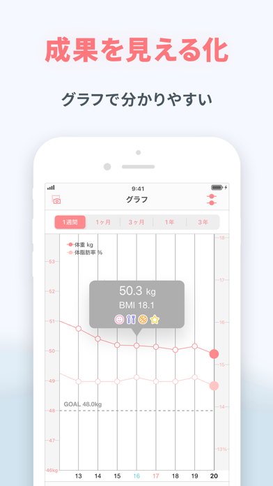 1日1回記入するだけの、シンプルな体重管理アプリです。記録したデータは見やすいグラフでチェック。体重の変化がひと目で分かり、モチベーションアップにもつながります。