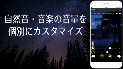 画面下部のバーを調整して、音量バランスを変えられます。あえて音楽を無音にして自然のサウンドだけを再生したり、逆に音楽のみを再生したりが可能。そのときの気分にあわせて変えられるところが魅力です。