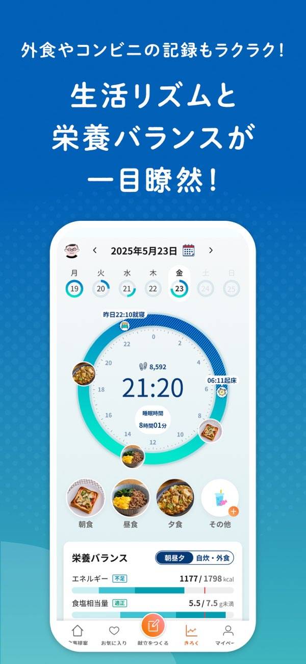 あなたの年齢や体重、身長などから毎日に必要な摂取カロリーを自動で計算します。カロリーだけでなく、たんぱく質や食塩量など細かく見られるので、健康管理をしている人にぴったり。1食ごとの栄養計算も確認できます。