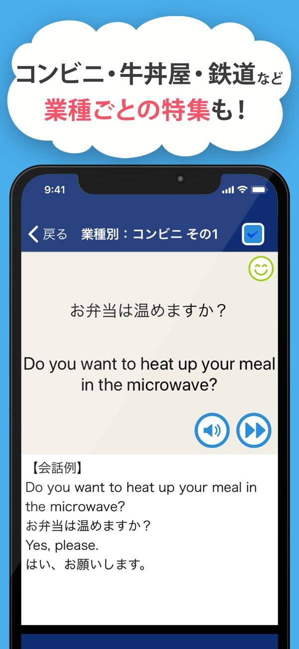 - 接客に役立つフレーズを1,200以上収録した英会話アプリ