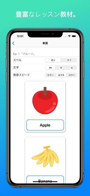 日常でよくあるシチュエーションのイラストを見ながら、英語のフレーズを学べるのがいいですね。単語カードをクイズ形式で当てるヒントゲームや、レッスンで学んだフレーズをつめこんだカラオケモードなどお楽しみ要素がたくさん。1レッスン25分間のちょうどいい時間もポイントです。