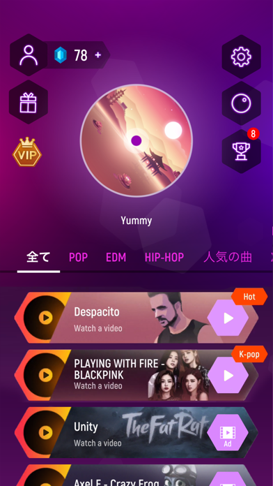 Marshmelloやレディー・ガガなど有名アーティストの楽曲を収録した音ゲーアプリ。完全無料で楽しめるのも魅力の1つです。しかし新しい曲をアンロックするには、広告を見る&ゲーム内で獲得したダイヤを使用しなければいけません。広告を見るのは億劫と感じる人もいるかもしれませんが、楽曲の視聴もできるので、プレイしたいものだけを選択してみては?