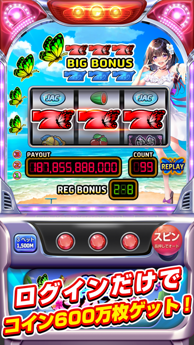 ログインや各種ボーナスでもらえるコインが多く、無課金でも遊びやすいのが特長。15分ごとに一定額のコインを補充できるので、手持ちのコインが尽きてもしばらく待てば遊べます。台にもよりますが、十数分も遊んでいれば、ちょっとした当たりが出るくらいには稼ぎやすい仕様。無茶な賭け方をしなければ、コイン切れに悩むことなく遊べるでしょう。