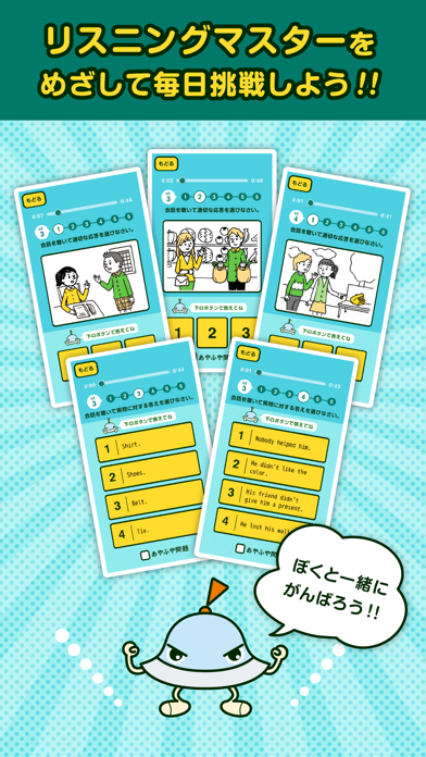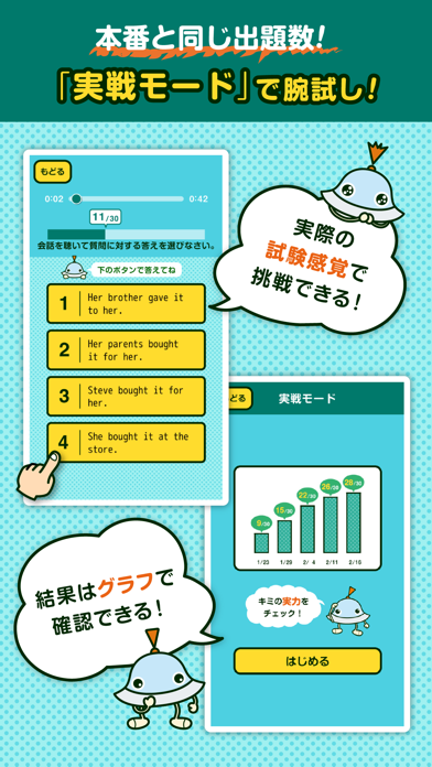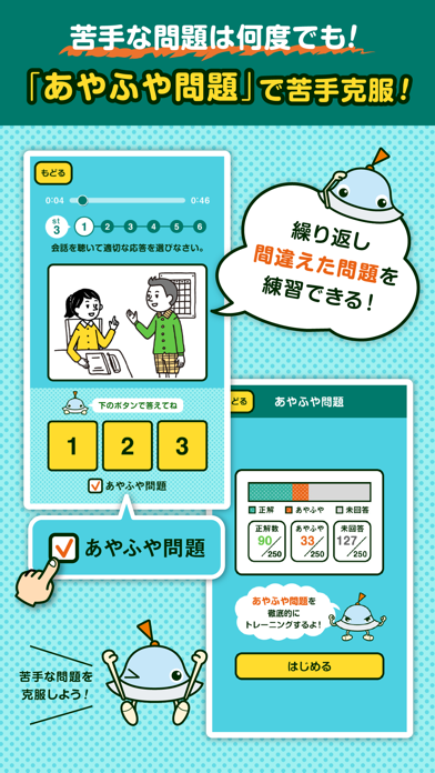 英語聴解力を鍛えるための2つのモードがあります。「ステージモード」から始め、慣れてきたら、「実戦モード」で本番さながらの挑戦が可能。間違った問題は「あやふや問題」として特訓できるため、無理なくステップアップが図れます。