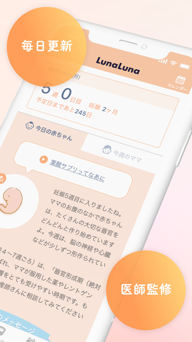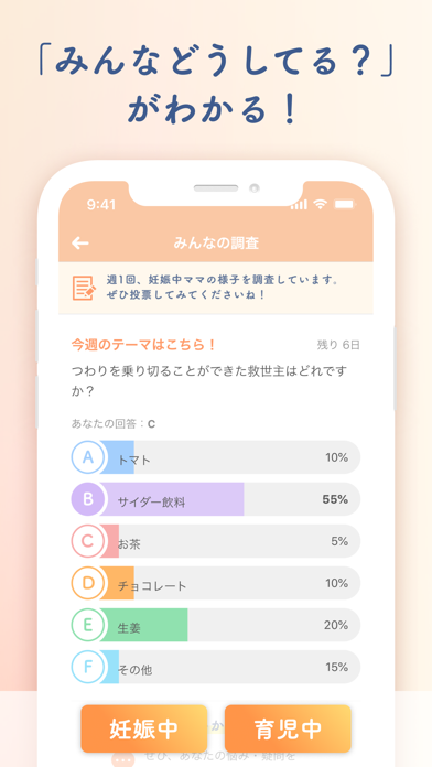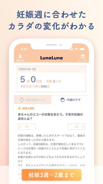 未来のママを全力でサポートするアプリ。妊娠週数を把握でき、赤ちゃんの成長を日々実感できます。出産に向けての準備もToDoリストで無理なく進められるので、不安を解消できるでしょう。