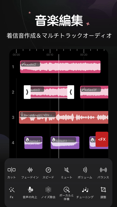 楽曲や音声のファイルに対し、カットや効果音の追加などの編集が可能。複数の音源をつなげてミックスすることもできるほか、加えられる効果音も楽器や爆発音など幅広くそろっています。