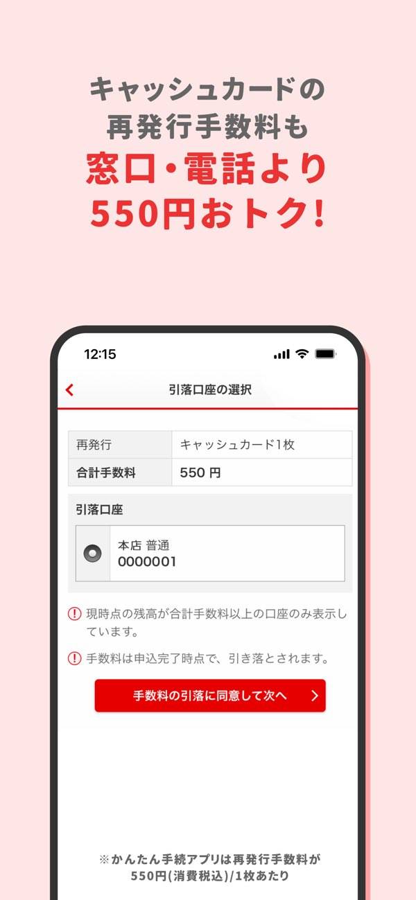 キャッシュカードや通帳の紛失・盗難による利用停止や、再発行の手続きが簡単に行えます。銀行に足を運ばなくても、手元で手続きができるので、時と場所を問わず安心して手続きが可能です。