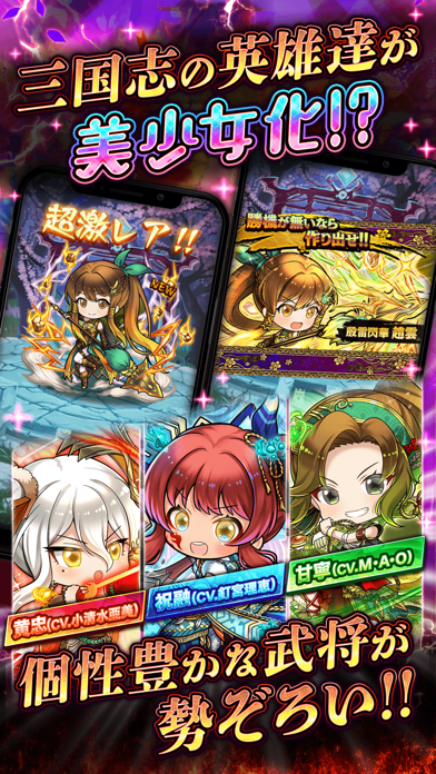 ▲三国武将たちが美少女キャラになって登場。カッコよさと愛嬌を併せ持ち、声優陣によるボイス付き。