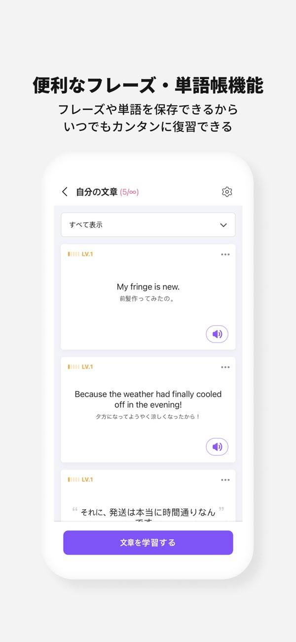 雑談の話題や相槌など、実用的に使える文章をピックアップ。重要なフレーズは3回繰り返されるので、発音の仕方をチェックできます。またフレーズの発音をチェックするスピーキング機能も搭載。評価Aを目指してチャレンジしてみてはいかがでしょうか。初級や中級など、細かくレベル分けされているのも嬉しいポイントです。
