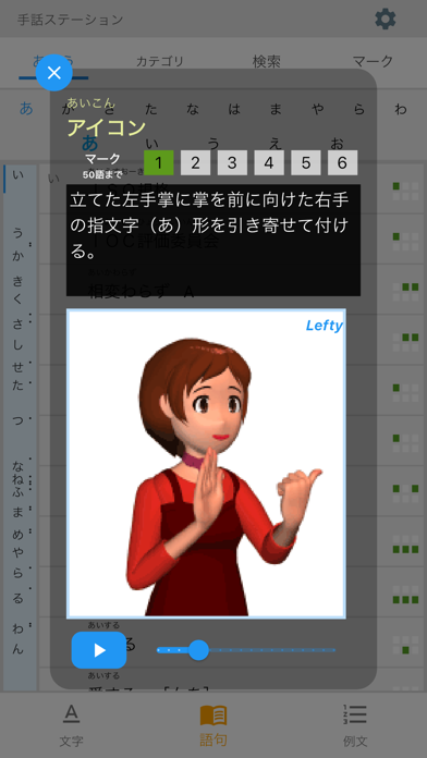 指文字や語句の手話表現をアニメ動画で確認しながら楽しく学べるアプリです。大きく見やすい画面で手の動きをゆっくり再生できるのが特長。語句の意味や表現の理由もわかるように説明があり、ただの暗記ではなく納得しながら覚えられますよ。