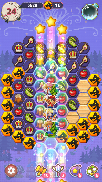 ピースを3つ以上消すとキャラピースに変身。キャラピースが3つ並ぶと、周りのピースと共にまとめて消えます。ピースを9つ以上まとめて消すと、フィーバータイムに突入! 7人のこびとが出てきたりマッチの火が舞い踊ったり、各おとぎ話ならではの演出が加わります。かわいらしく凝った作りで、眺めているだけでも楽しめるでしょう。