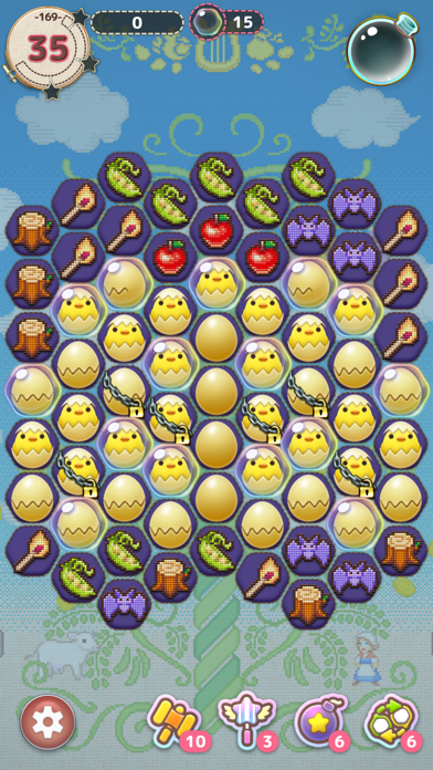 ▲りんごや豆など様々な形のピース。3つ以上並んだものをタップすると、ピースの形にちなんだキャラに変身する。
