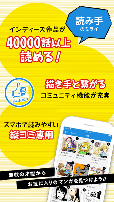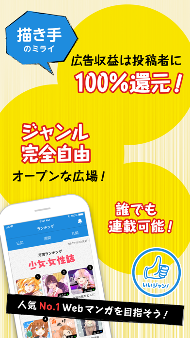 ジャンプが新人発掘のために開発したアプリです。アカウントを作れば誰でも漫画を投稿でき、人気作品は『ジャンプ+』でインディーズ連載する権利を得られることもあります。また、アプリの広告料は100%作家へ還元される仕組みがあるため、新人作家の支援にも繋がります。