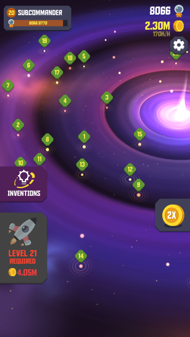 ゲーム内コインで乗員の追加やロケットの改造が可能。乗員を一定数別の惑星に送り届けると、レベルが上がり次のエリアに移動します。貰えるコインは飛距離に応じて増減するので、なるべく遠くまでロケットを飛ばしましょう。
