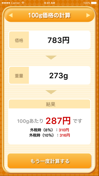 - 100グラムあたりの値段を瞬時に計算してくれる