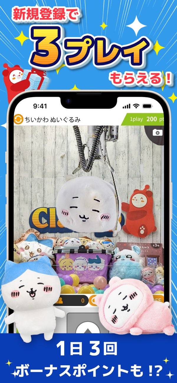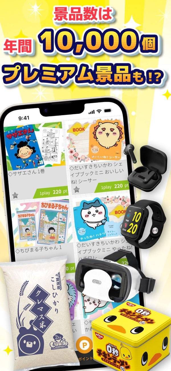 流行りのアニメや漫画キャラクターの景品が豊富! しかも5回分は無料というお得なサービスが付いています。ログインボーナスやイベントなどでも、無料チケットやポイントなどを配布する予定。上手く消費していけば、通常より安く景品をゲットできるでしょう。