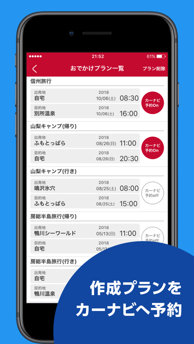 よく行くスポット、または行きたいスポットがあちこちにあり、頻繁に運転するという人に向いているアプリです。カーナビと連携することでブックマークしたスポットを転送したり、アプリ側で作成したプランを転送することも可能。プラン作成が少々面倒に感じる部分もありますが、手持ちのカーナビもきちんと活用できるのは嬉しいです。