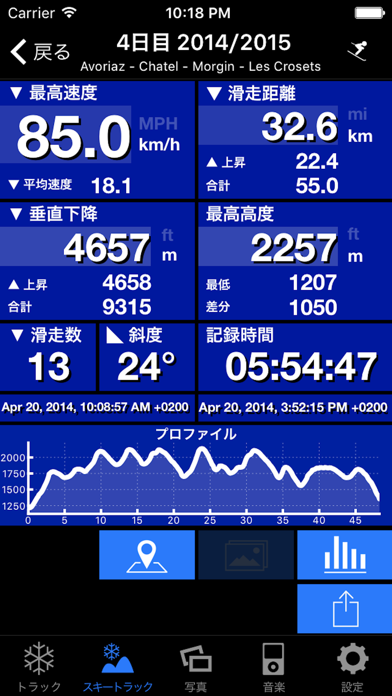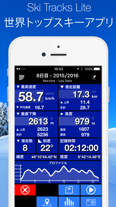 グラフや数値で記録を確認できます。記録中に何本滑ったのか、傾斜はどれくらいあったのかなど、さまざまなデータをチェックできるのが特徴。記録する際には、画面右下の再生ボタンをタップしておけばOKです。