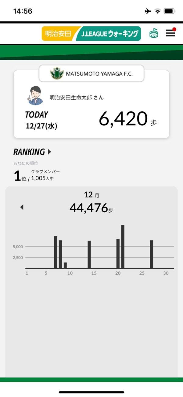あなたが歩いた歩数を記録して棒グラフで表示してくれます。クラブメンバー内の順位も表示されており、モチベーション維持につながるでしょう。アプリを使うためには、スマートフォンの健康管理アプリとデータを連携する必要があります。