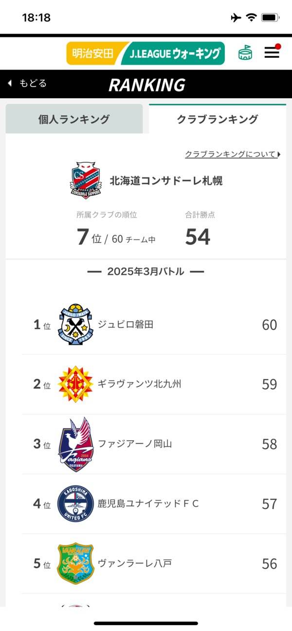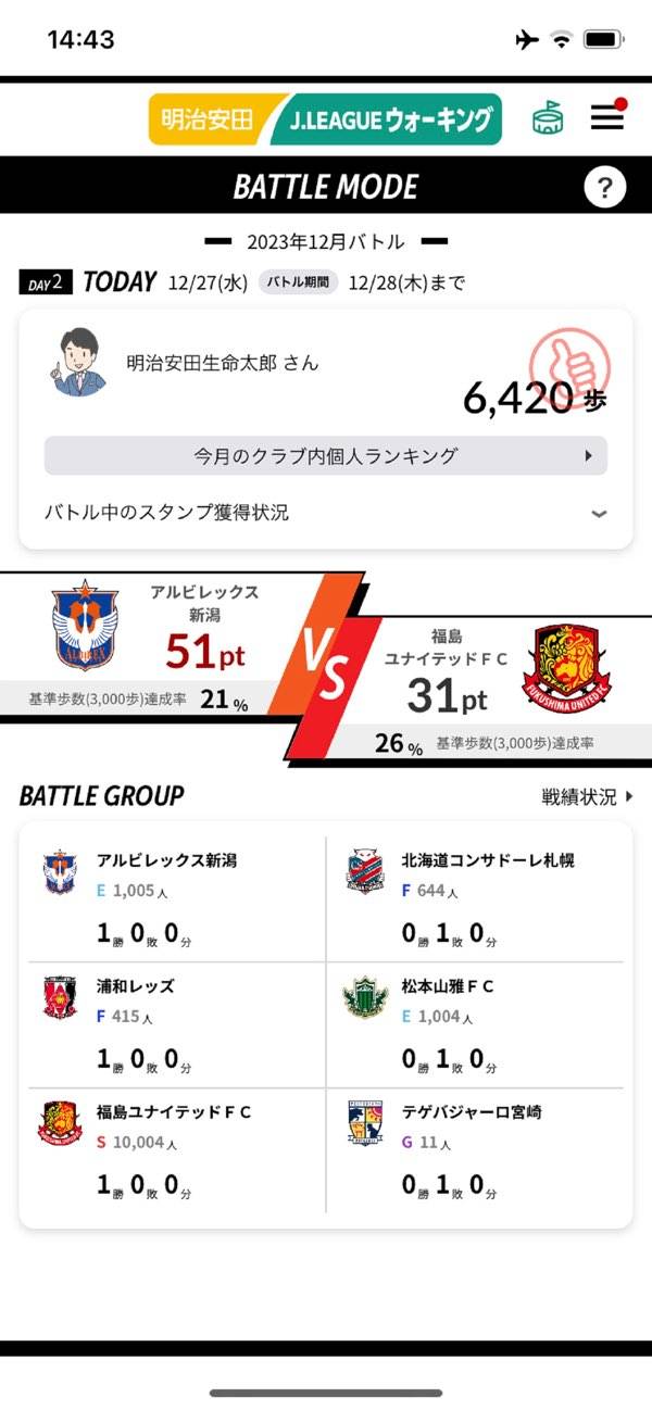 所属チームごとにメンバー全員の合計歩数で競うバトルが開催されます。自分の運動がチームの応援となる仕組みは、健康づくりを通じたチーム応援の喜びを感じられるでしょう。個人ランキングとともに楽しんでみてください。