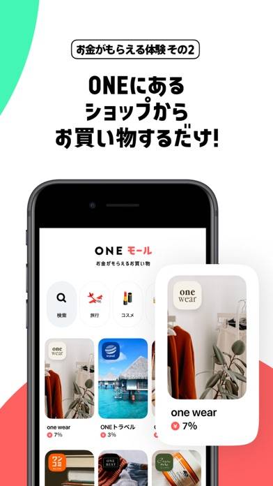 いつもの買い物でお小遣いをゲットできる、お買い物サポートアプリ。レシートを送信するだけでキャッシュバックされる「ONEレシート」と、モール内のショップで購入すると数パーセントの金額が戻ってくる「ONEモール」が使えます。洋服やコスメなどを買うついでに報酬がもらえて、日々の買い物がさらに楽しくなります。