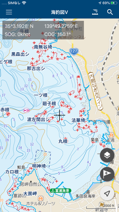 周辺の爆釣ポイントなどを表示してくれる海釣り専用マップ。魚が集まりやすい魚礁がある場所や、水面標高の深さが10メートルごとになっている等深線などを確認できます。