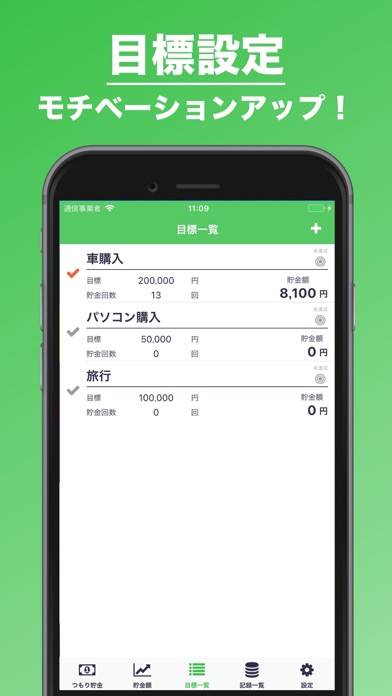 欲しいものや旅行計画など、あなたの目標を設定可能。目標はいつでも自由に変更でき、達成感を味わいながら次なる目標に進めます。達成した目標は消えずに残るので、履歴を見るたび、これまでの努力を確認できるでしょう。