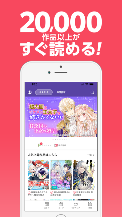 ▲毎日8時、20時に無料チケットを配布。ストアのマンガを購入する場合は課金してコインをチャージしよう。