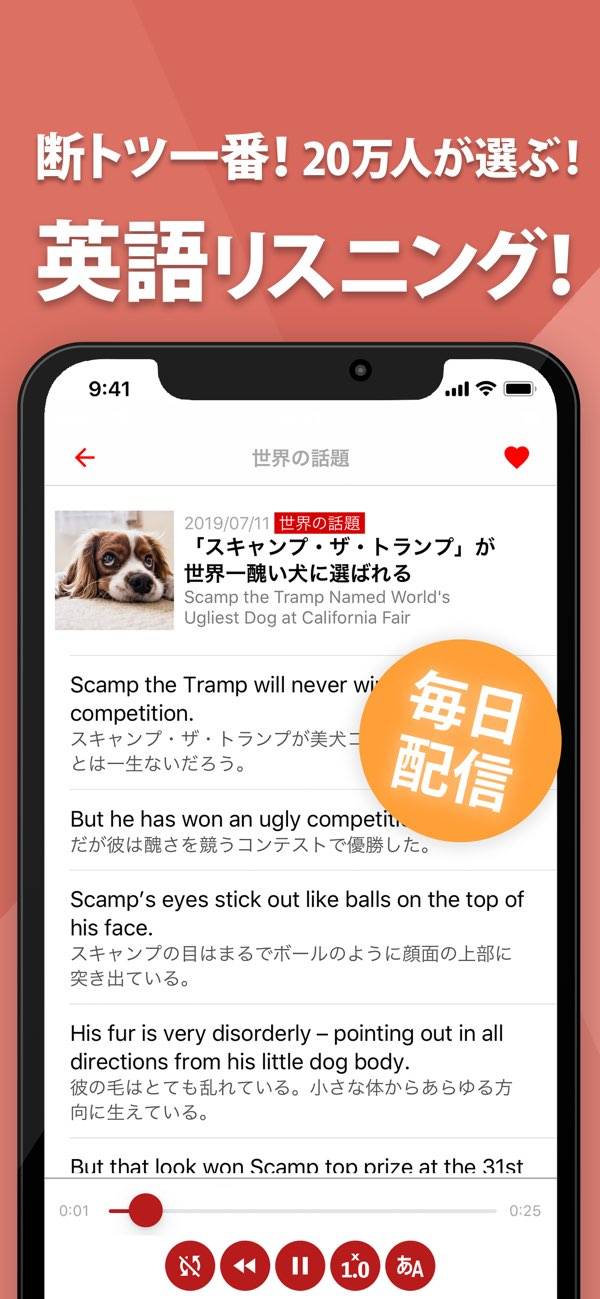 日常会話からビジネス用語まで多様なリスニング学習が可能なアプリ。リピート再生や倍速機能で自分のペースに合わせて学習ができ、日英字幕スクロール表示で聞き取りが難しい部分も即座に確認できます。