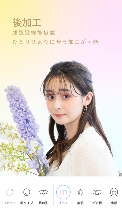 プリクラ機の技術をもとにした編集機能で、明るさや肌の質感をなめらかに整えて撮影できます。光のバランスや色味も自動で調整されるので、特別な加工をしなくてもきれいな写真に。気になる部分を飛ばしすぎず、自信を持てる自然な仕上がりに見せてくれますよ。