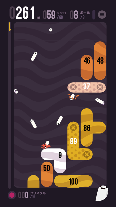 ▲タップして狙いを定め、ブロックにぶつける。ブロックに書いてある数字は、壊すのに必要なヒット数。