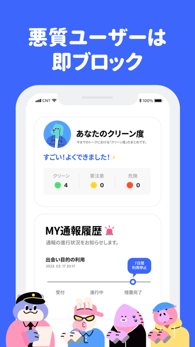 悪質なユーザーをブロックする機能が整っています。出会い目的の利用やタメ口・複数人でのトーク参加などの禁止事項があり、違反すればアカウント停止の措置がとられます。明確な利用ルールと運営ポリシーがあるため、安心して利用できるでしょう。