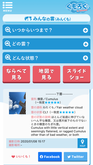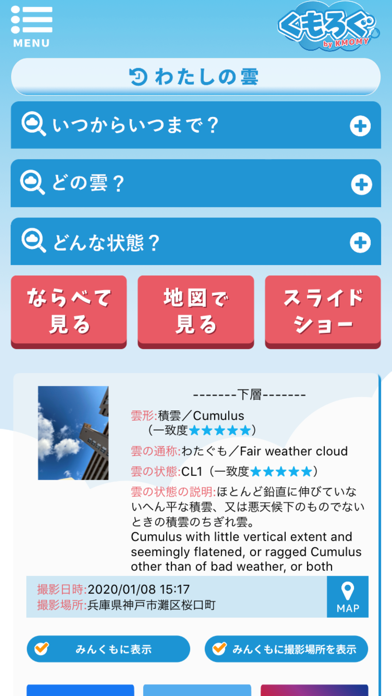 撮影した雲の写真はほかのユーザーも閲覧でき、いいねがもらえることも。