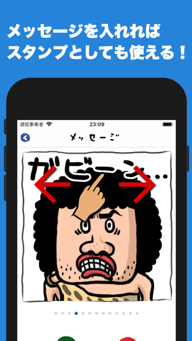 本アプリでは、出来上がった画像にメッセージを入れられます。メッセージはすでに用意されているので、スワイプ操作で選ぶだけ。「いいね!」「・・・・。」「りょーかい」などスタンプに使えそうなメッセージが13種類用意されています。