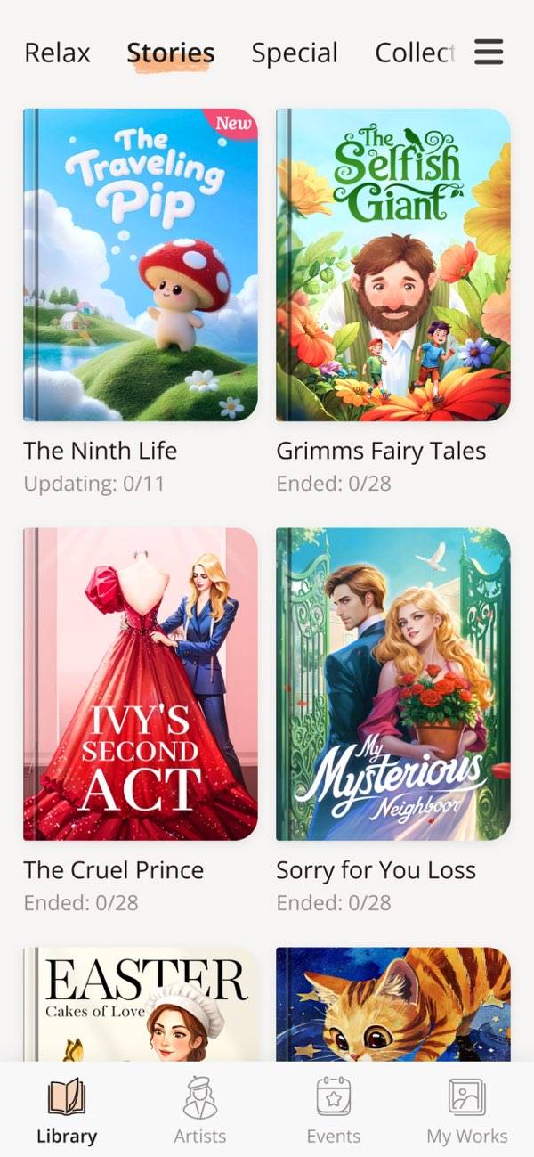 ファンタジーが好きな人には、ストーリー形式のイラストがおすすめ。いくつかのイラストが一連の流れでつながっており、絵本を読んでいるような感覚を体験できます。途中の塗り絵は保存しておき、続きから再開できるので、スキマ時間にぴったりです。