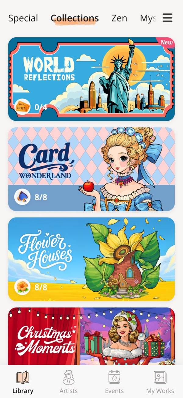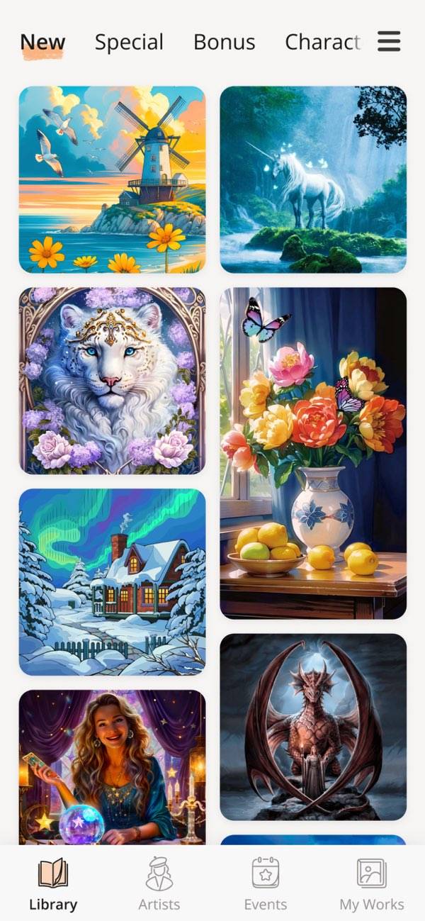 キャラクターや動物、マンダラ模様など、幅広いジャンルが揃っています。さらに新たなイラストが、毎日アップデート。特定のジャンルに偏りがないため、そのときの気分に合わせて遊べます。