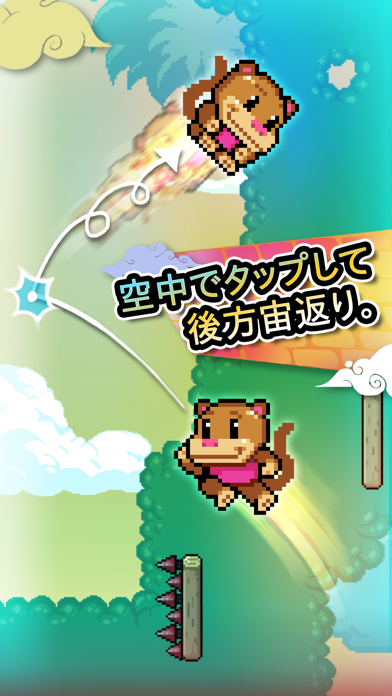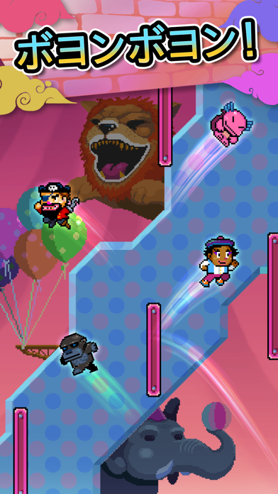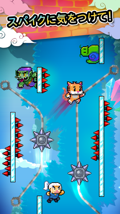 画面を長押しするほどジャンプの飛距離が伸び、キャラクターの挙動もゆったりとしているので思い通りにコントロールしやすいです。ステージにそびえる数々のトラップをくぐり抜けるほど、興奮と緊張が高まっていくはず。