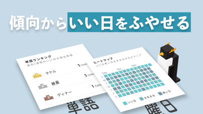 幸福度をワンタップで入力できる、手軽な日記アプリです。文章を追加でき、通常の日記のように使うことも可能。日記には毎回、ランダムにペンギンの画像が貼られるので、あまり気分がよくない日でも少し癒やされるでしょう。