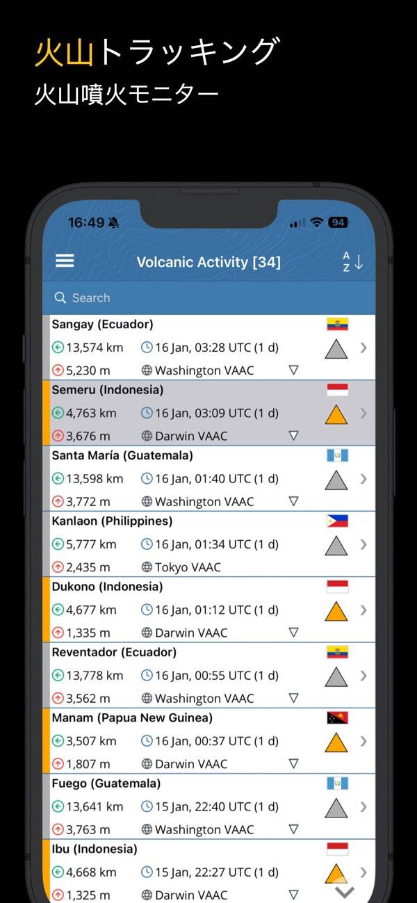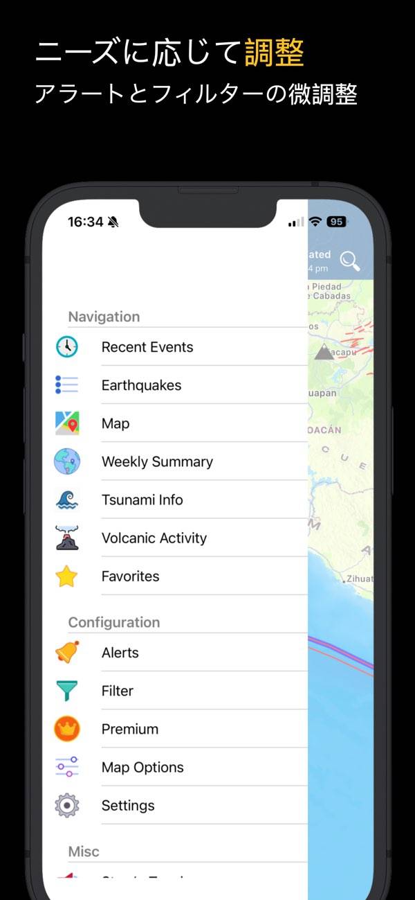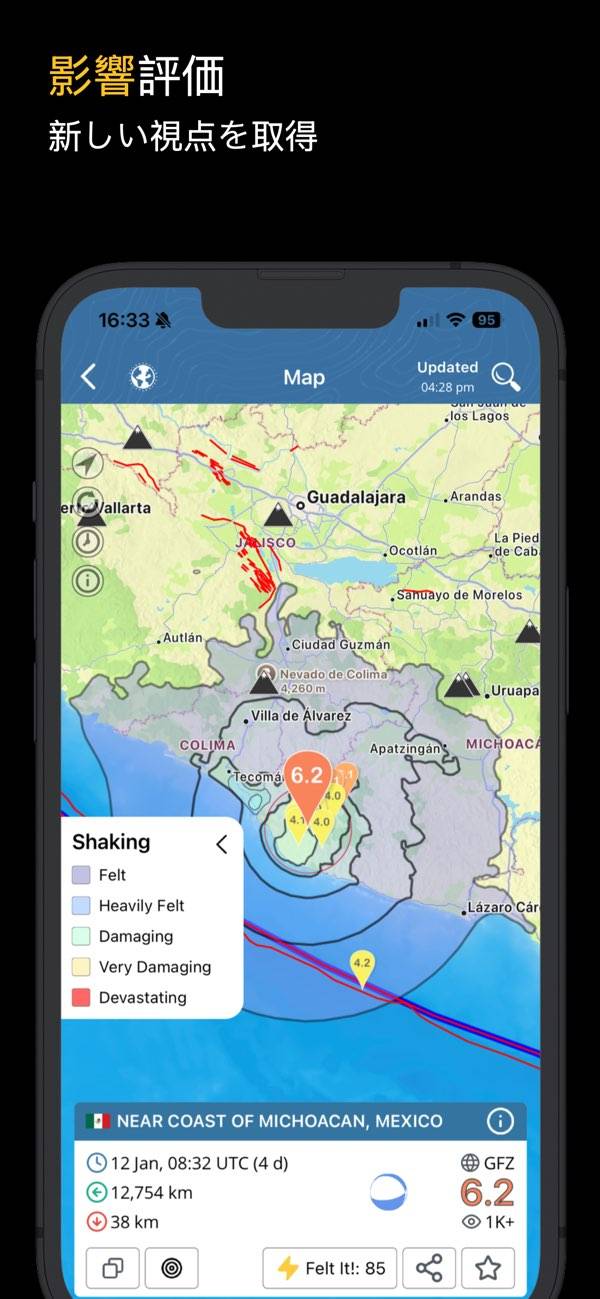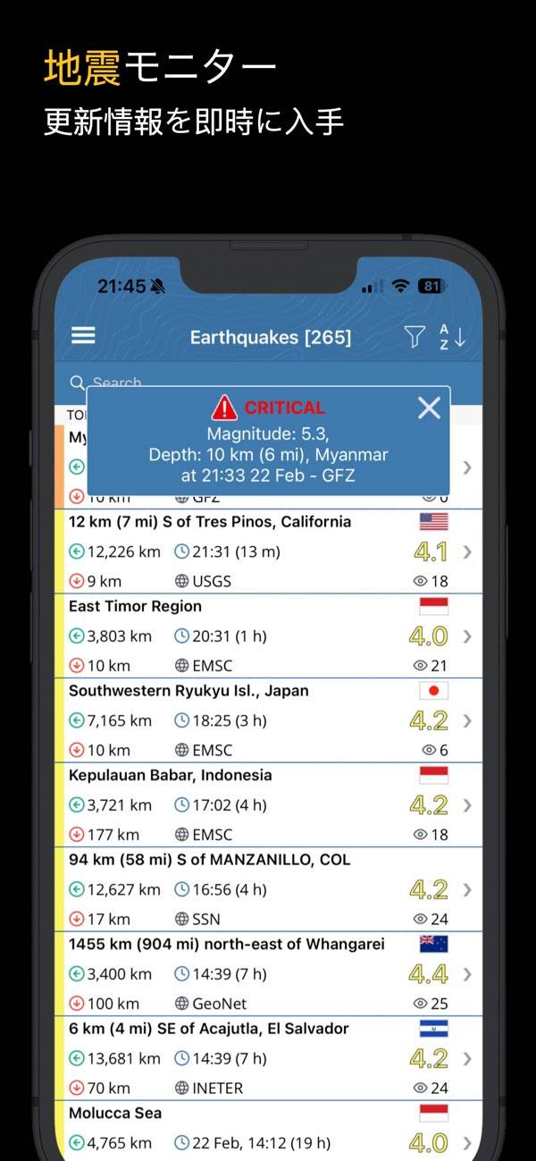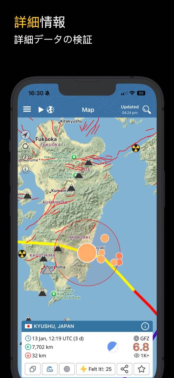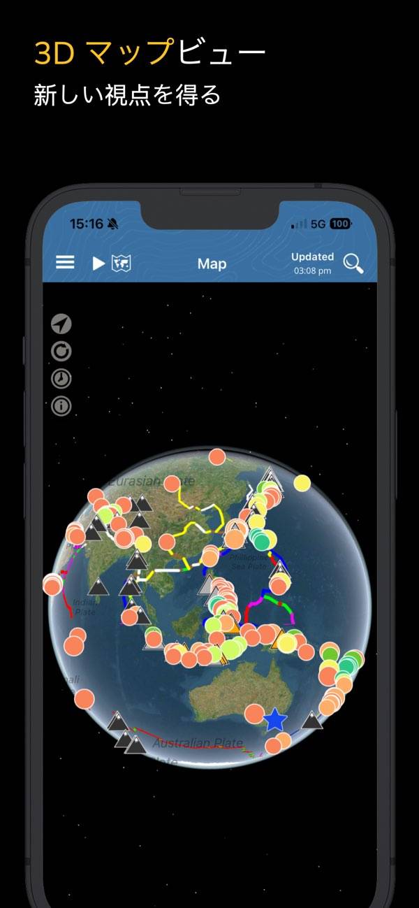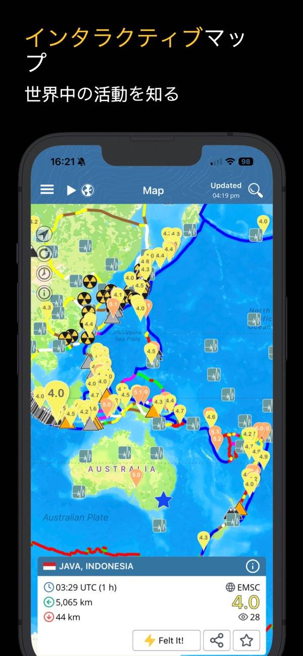 最近発生した地震がマップ上に表示されるのが特徴。震源地だけでなく火山や原子炉などもマップ上に表示されていますが、アイコンの非表示機能などは無いので若干ごちゃついているのが気になるところです。