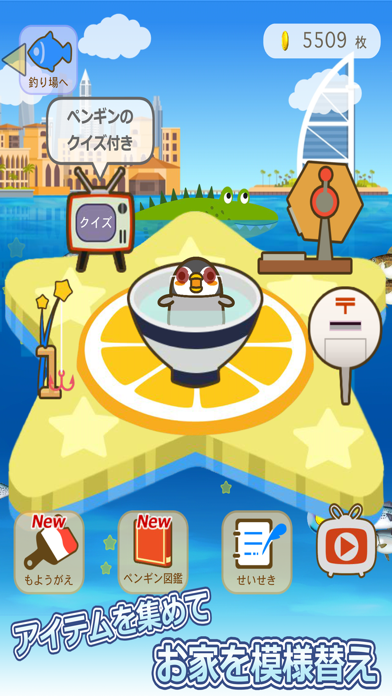 釣った魚の数に応じて新しいステージなどが開放。ペンギンのファッションアイテムや船のデザインも収集でき、やり込みがいがあります。