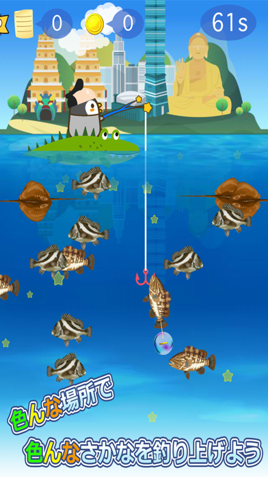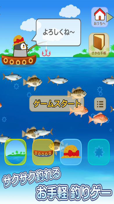 - ペンギンを操作して海で魚釣りが楽しめるまったりした釣りゲーム