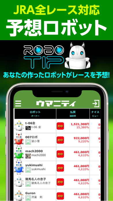 「ROBOTIP」機能で自分の予想スタイルをインプットしたAI予想ロボを簡単に作成可能。自分なりの予想理論をAIに学習させることで、より効率的で一貫性のある予想が可能に。投票締め切り時間が少ないときでも、「ROBOTIP」で自分なりの予想を瞬時に行えます。