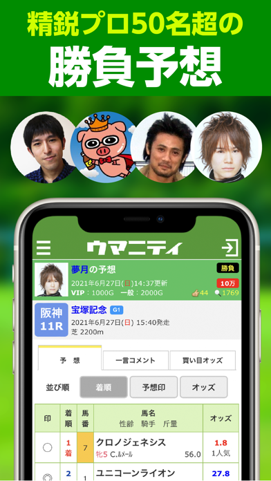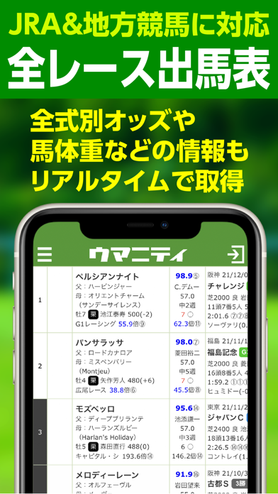競馬予想の的中率が上げたい人向けの競馬予想アプリです。回収率を公開するプロ予想家のガチ予想を参考にでき、ウマニティ独自のU指数(スピード指数)でデータから馬の能力を科学的に分析可能。自分の予想理論をインプットしたAI予想ロボも作成でき、JRA・地方競馬すべてのレース情報がこのアプリ一つで完結します。