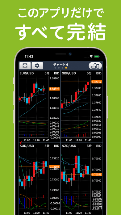 リアルタイムで動くチャート上に、注文ボタンや建玉のラインがそのまま表示されます。スピード注文に対応しているため、チャートを見て「いま!」と思った瞬間にワンタップで新規注文や決済が可能。テクニカル指標を同時に見ながら動けるので、判断もしやすく、細かいタイミングでも逃しません。