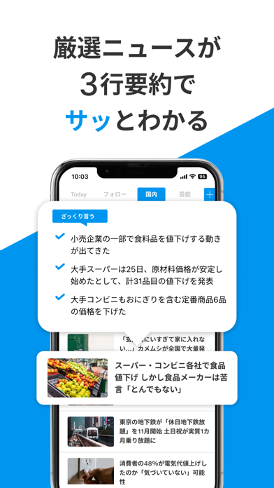 主要ニュースを3文に要約してくれています。写真と要約で、忙しいときでも今のトレンドをしっかり把握。スワイプで次の記事に移ったり、記事の詳細が読めたりと操作性も抜群です。
